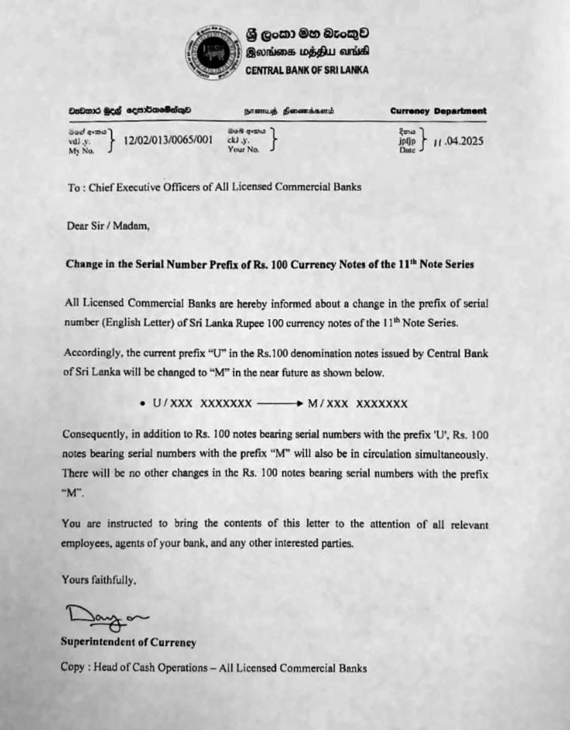 In 2018 Rs100 currency Notes dated 2016-07-04 with Signatures of Ravi Karunanayake & I. Coomaraswamy appeared in Circulation. Note with U/470 dated 2015-02-04 was found the U/470 which exceeded the CBSL posted max for that date which has put into question the ranges of Serial numbers used for each date and was corrected with reply to RTI.